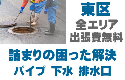 東区で排水つまり、トイレ詰まり、シンクつまりなどの排水トラブルはお任せください。店舗の厨房、グリストつまりも対応しております。